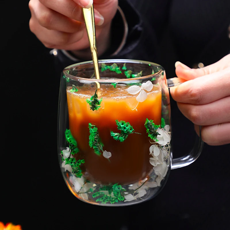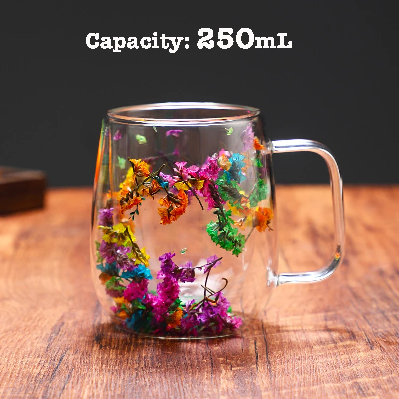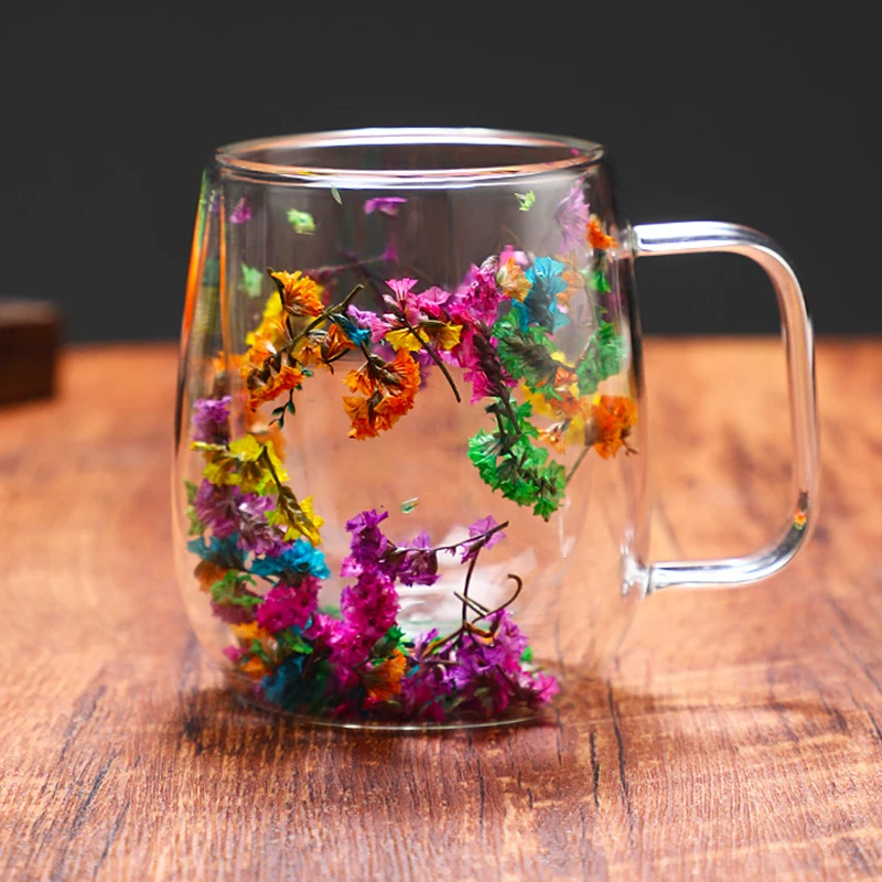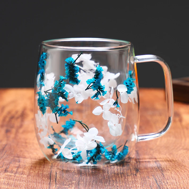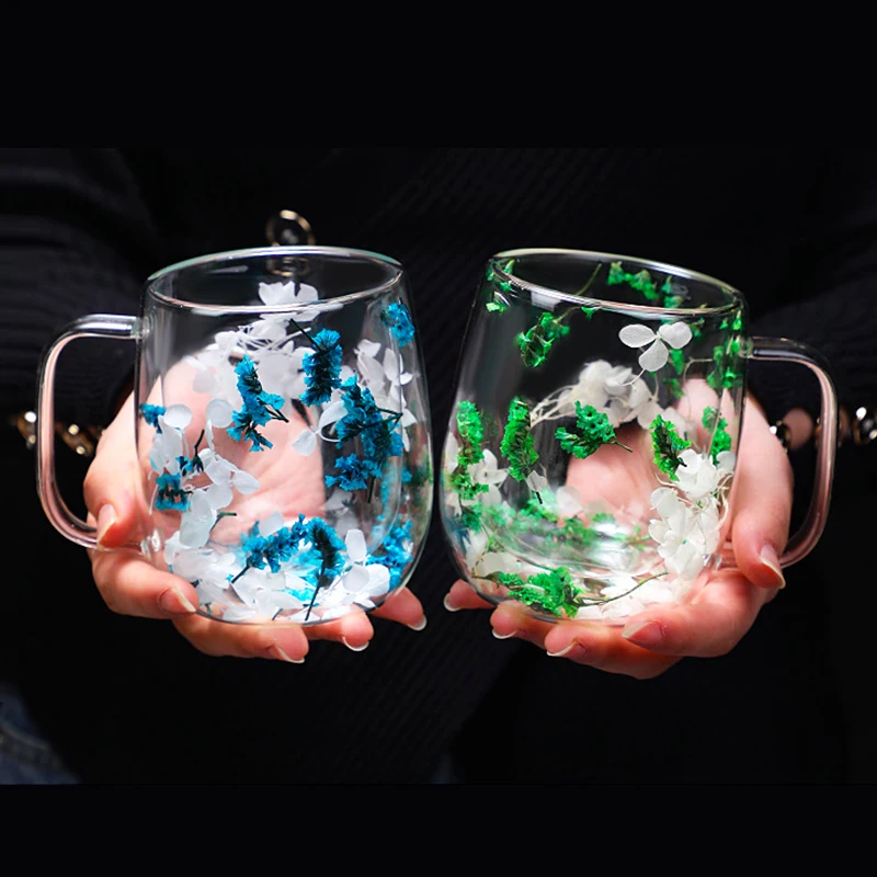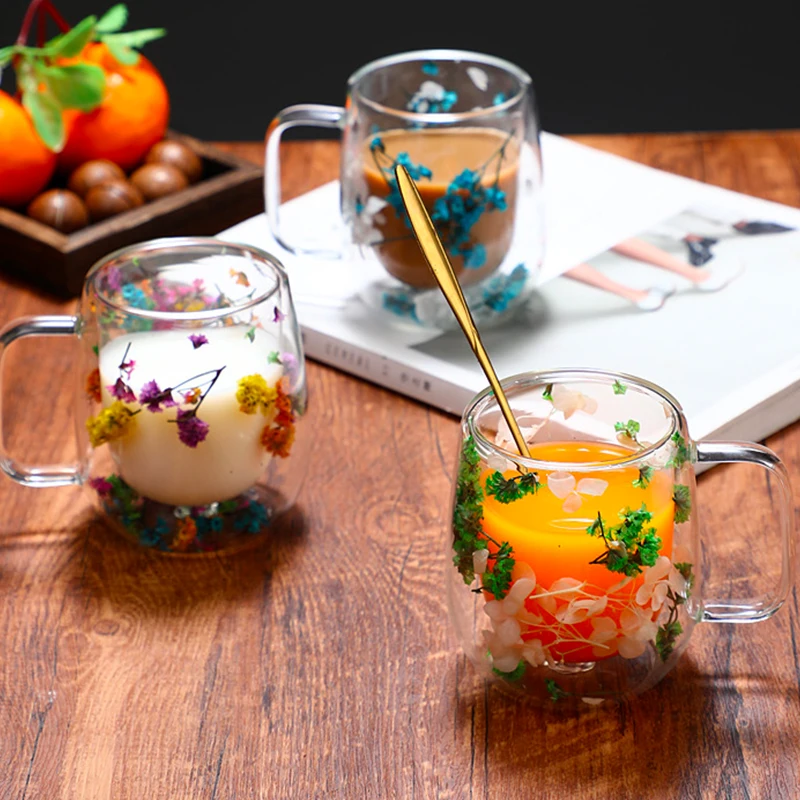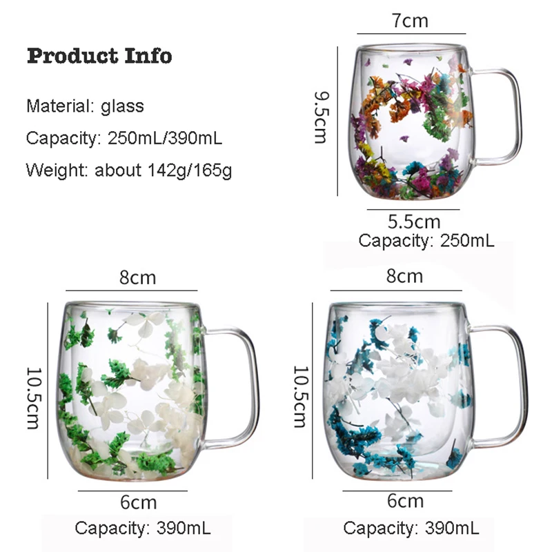 اسم المنتج: أكواب القهوة مع الزهور المجففة والزجاج كوب زجاجي مزدوج معزول أكواب زجاجية شفافة مبتكرة مع مقبض لهدايا عيد الميلاد